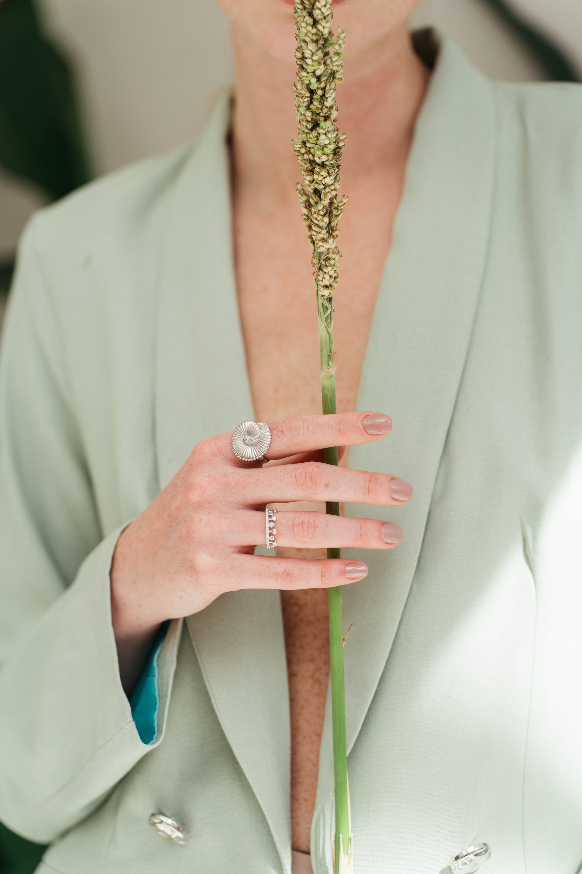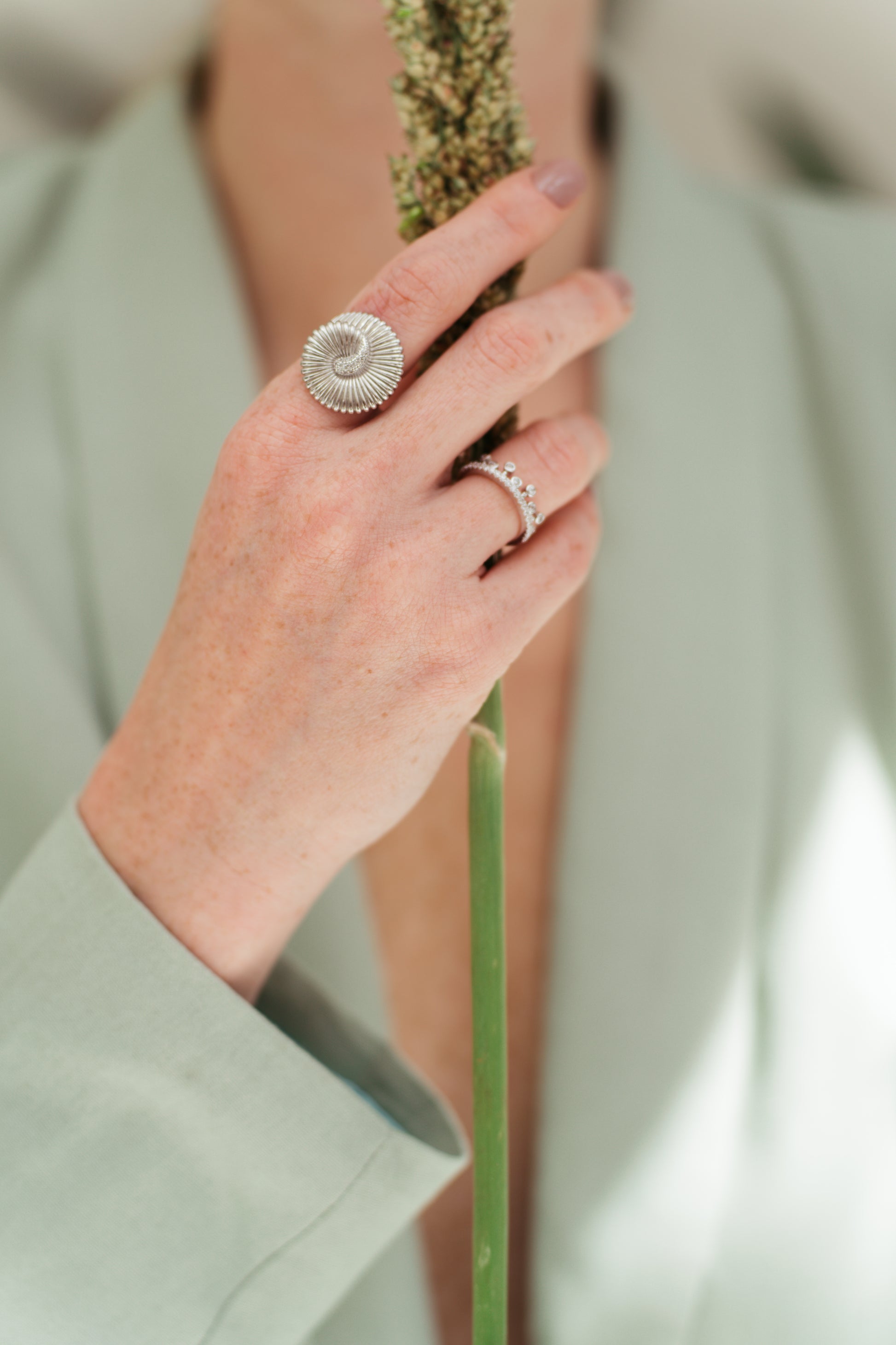 Anel com textura efeito caracol com zircônias brancas no banho ródio branco.