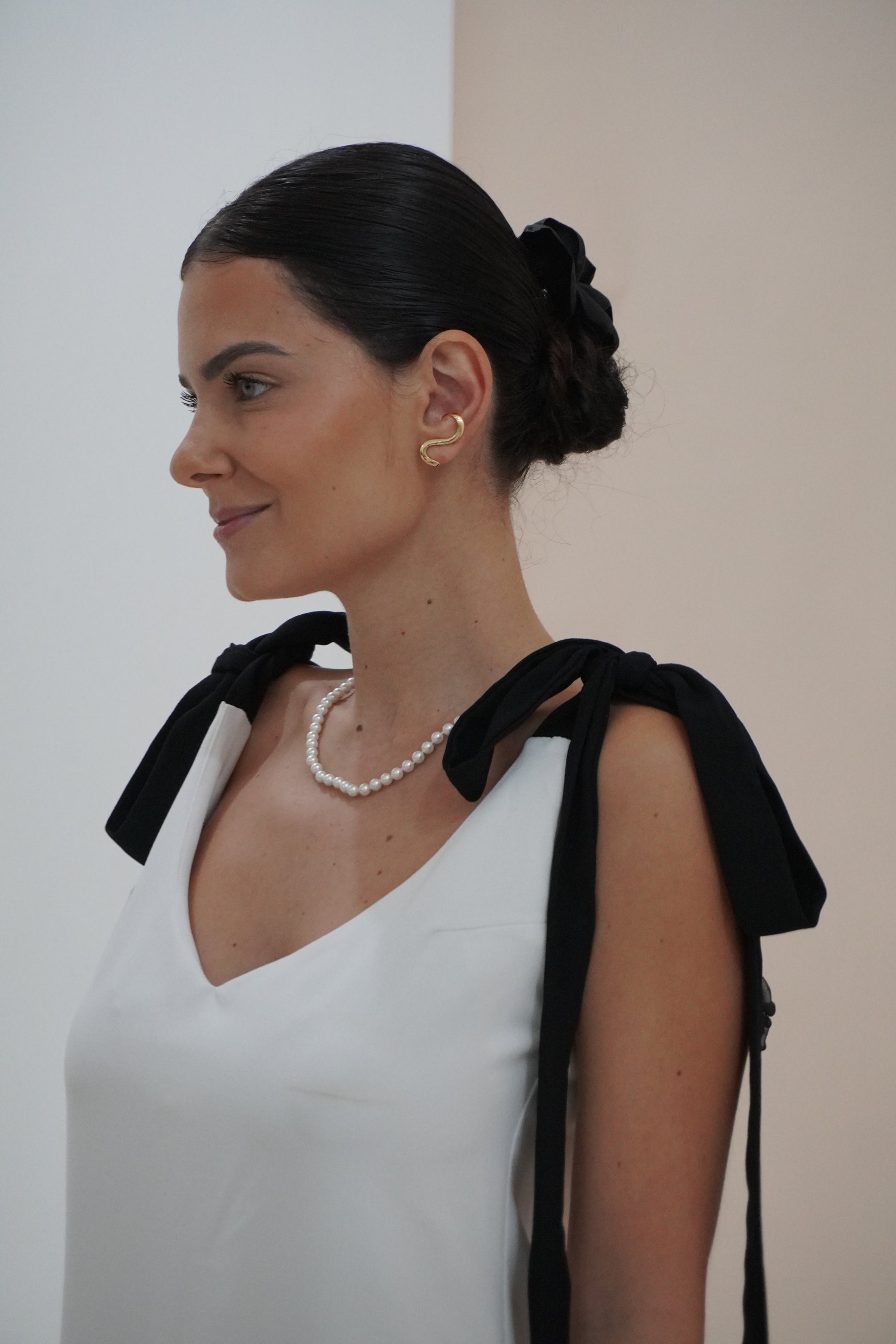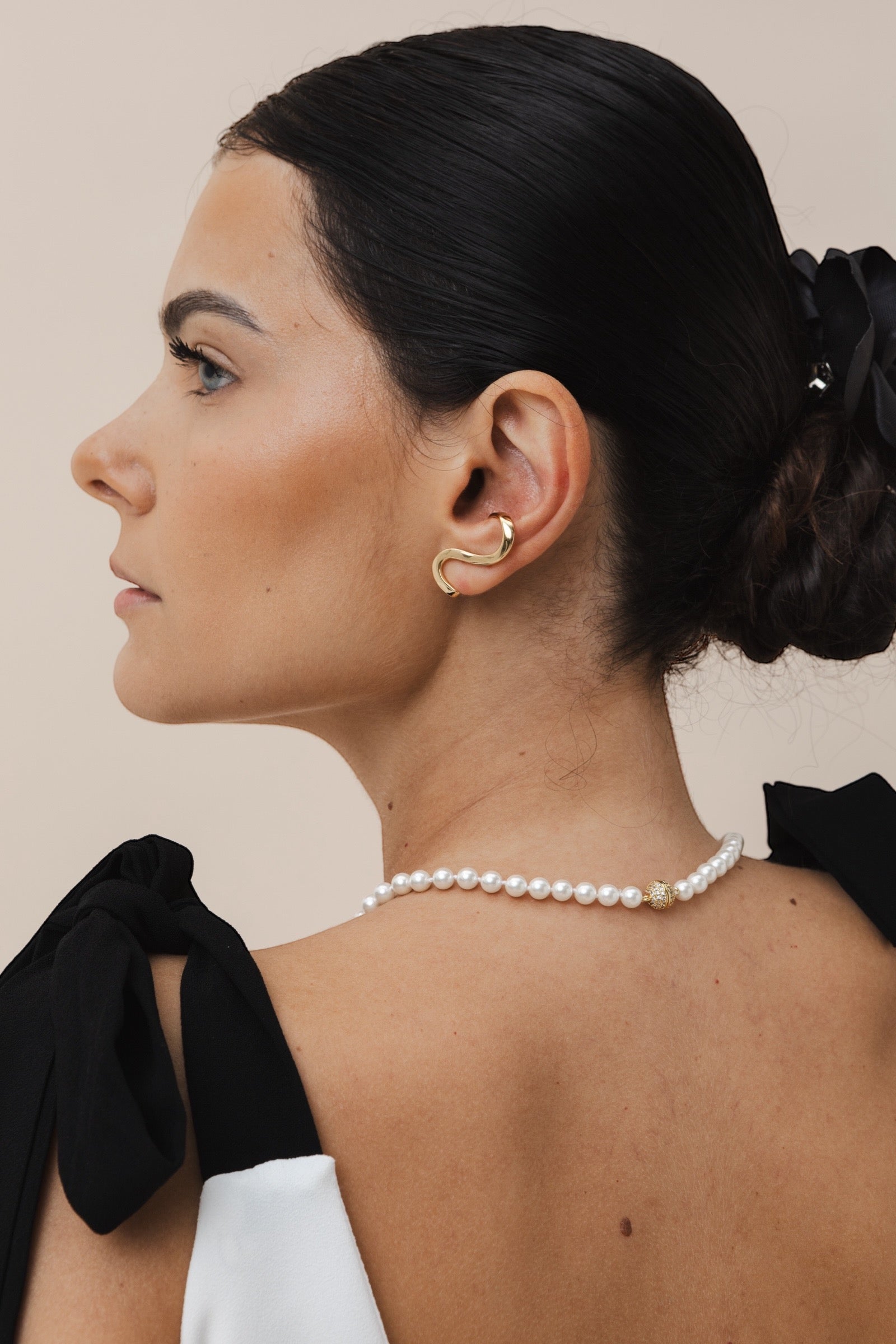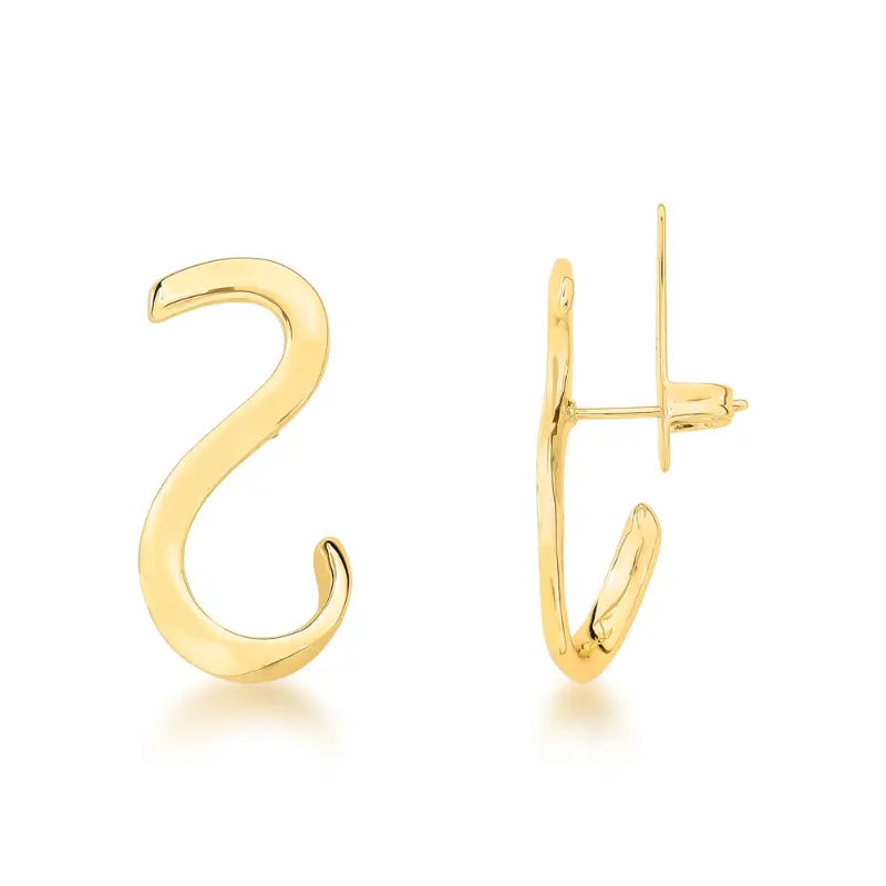 Brinco liso no formato S (podendo ser usado de 2 formas, uma como earcuff ou em pé como S) banho ouro 18k.