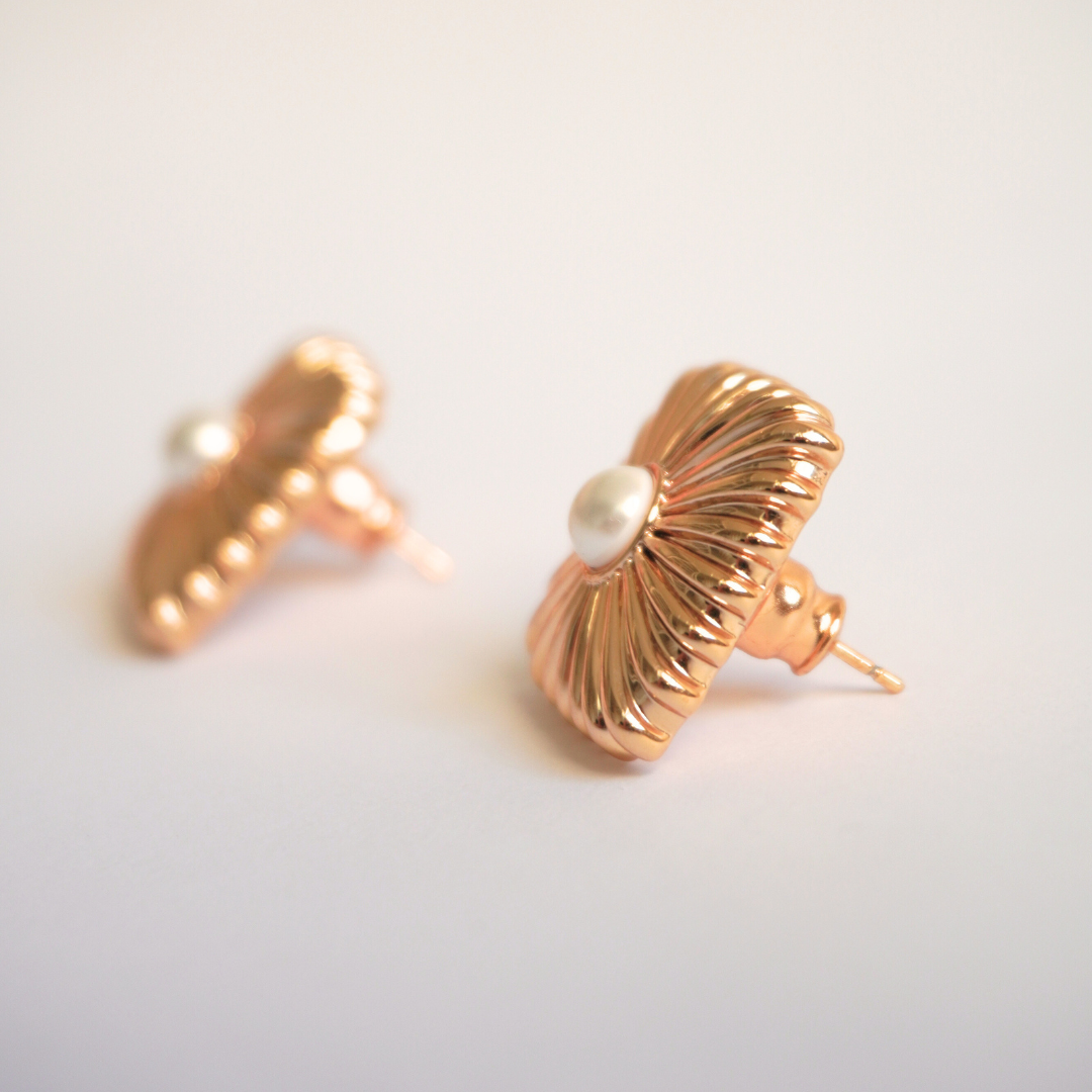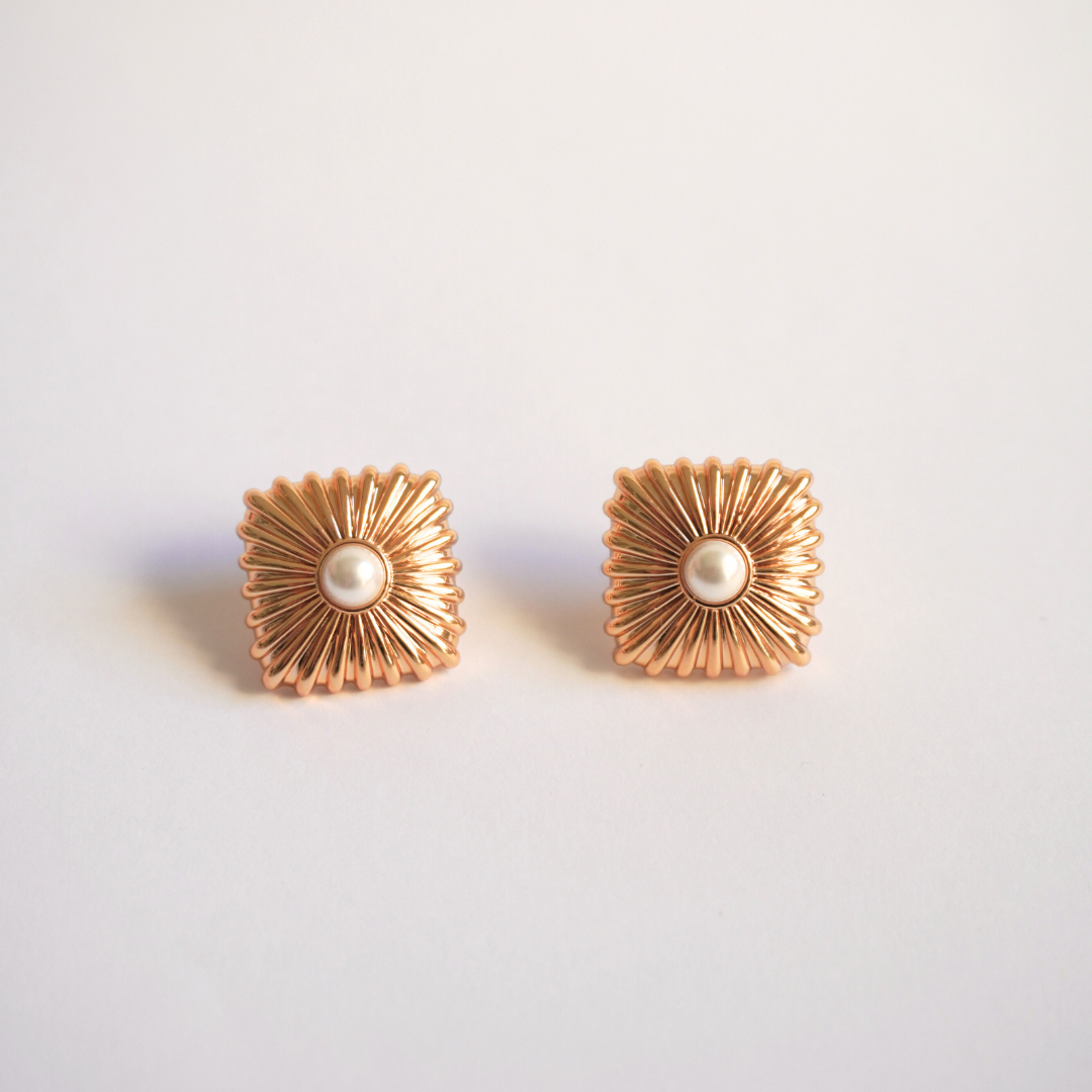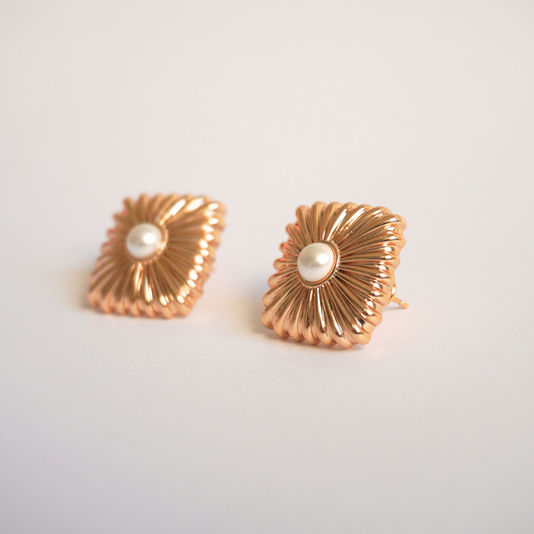 Brinco quadrado com textura de linhas finas e mini pérola ao centro no banho ouro 18k.