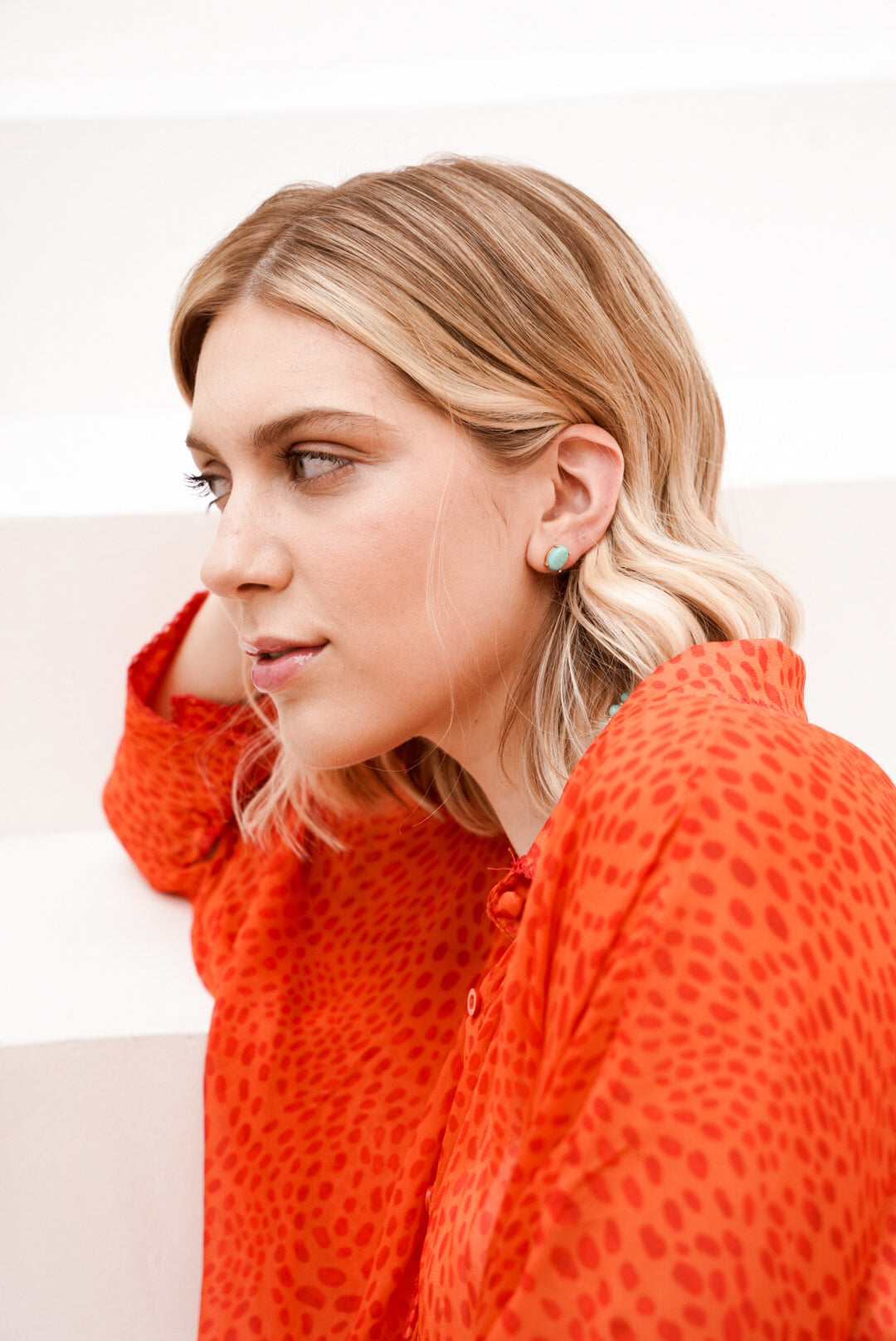 Brinco ponto turquesa de pedra natural com base em metal no banho ouro 18k.