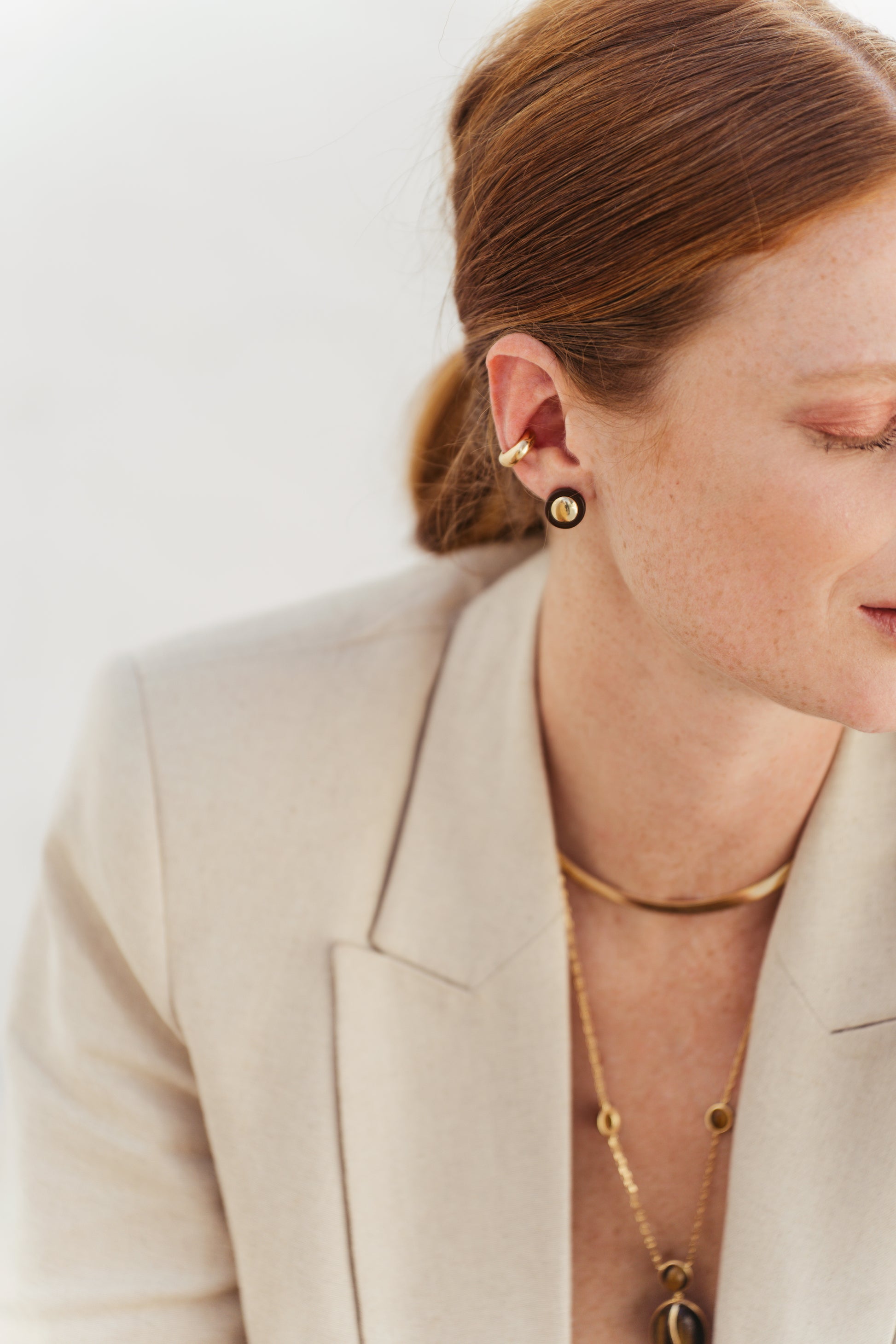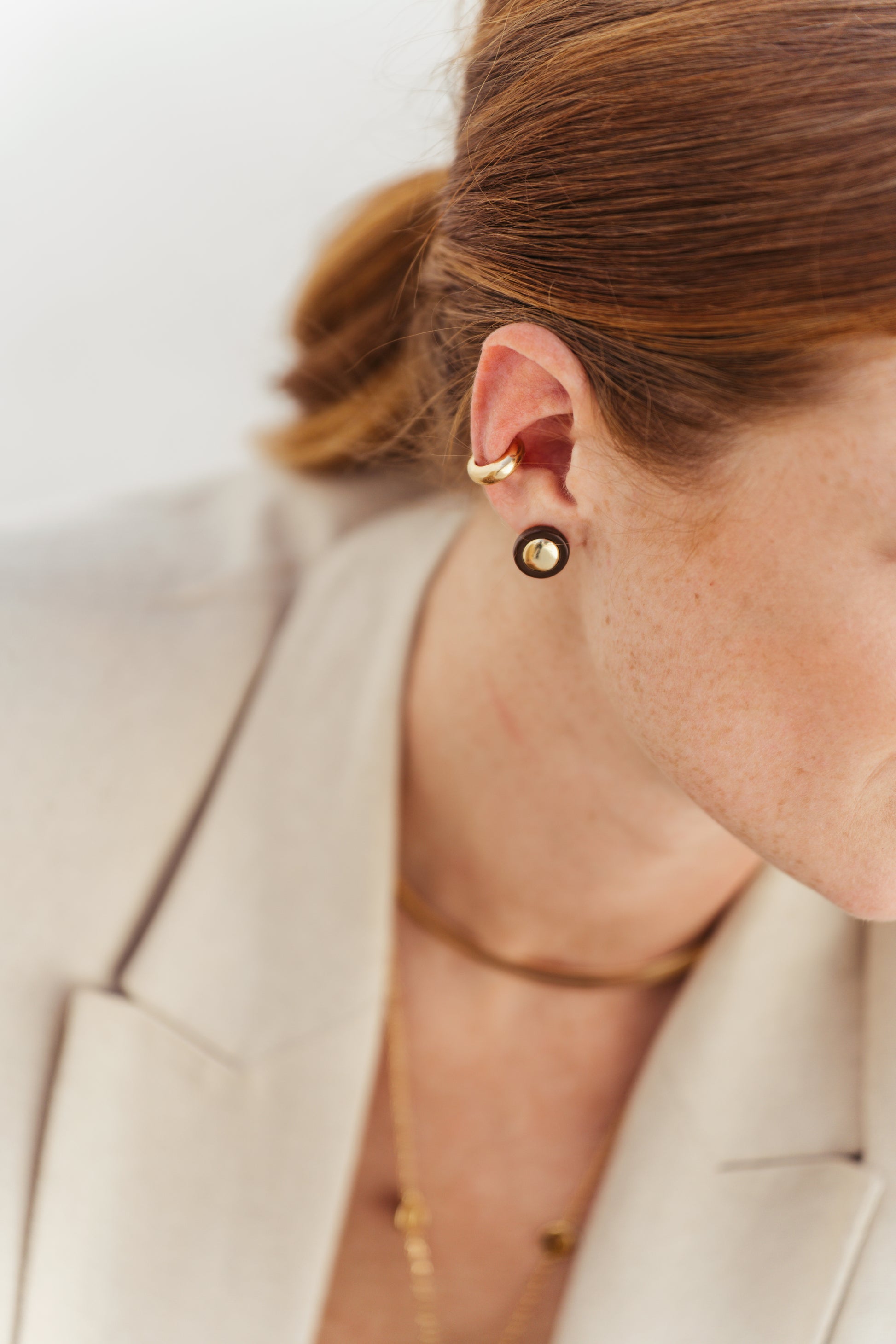 Brinco círculo com resina marrom e metal em banho ouro 18k.