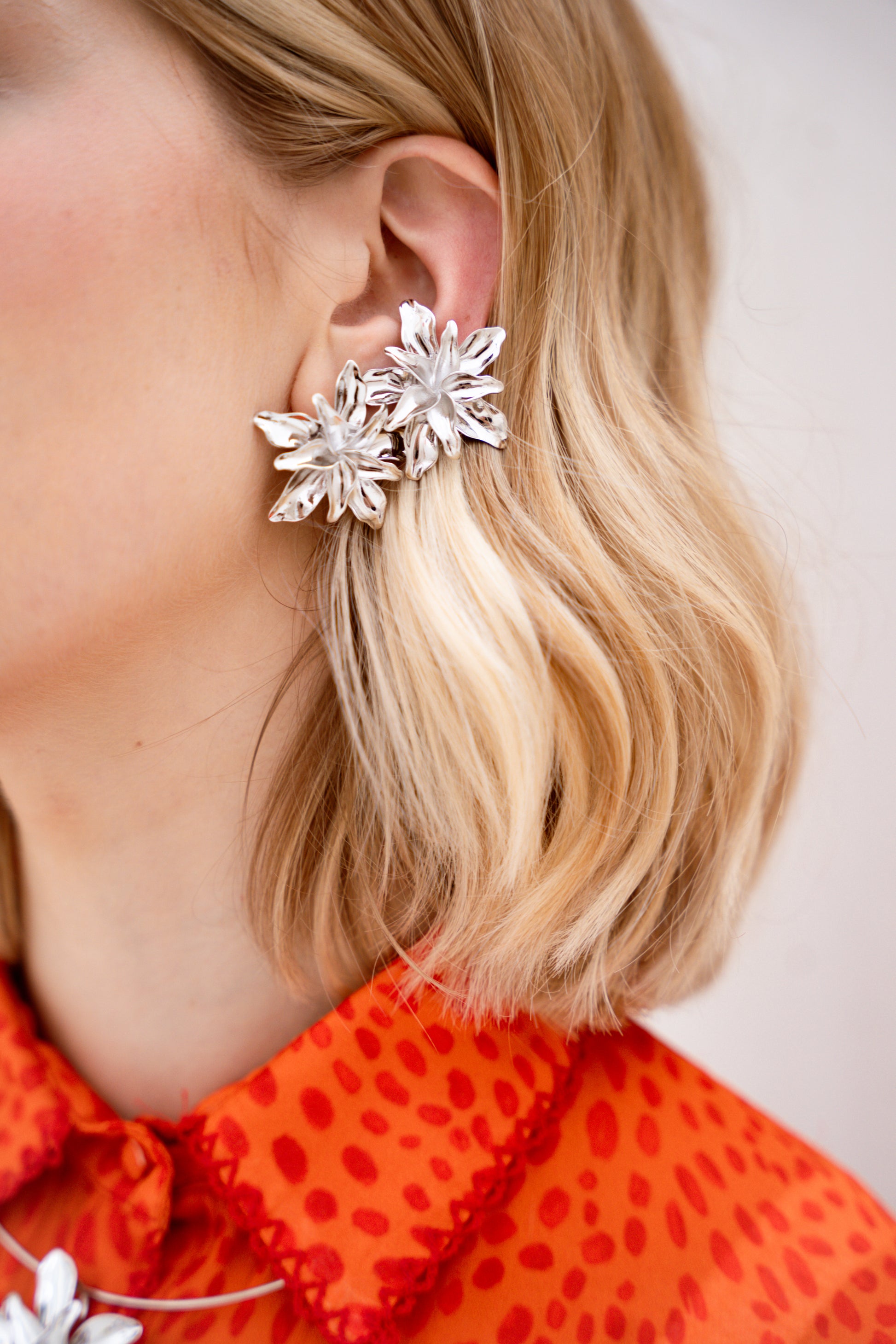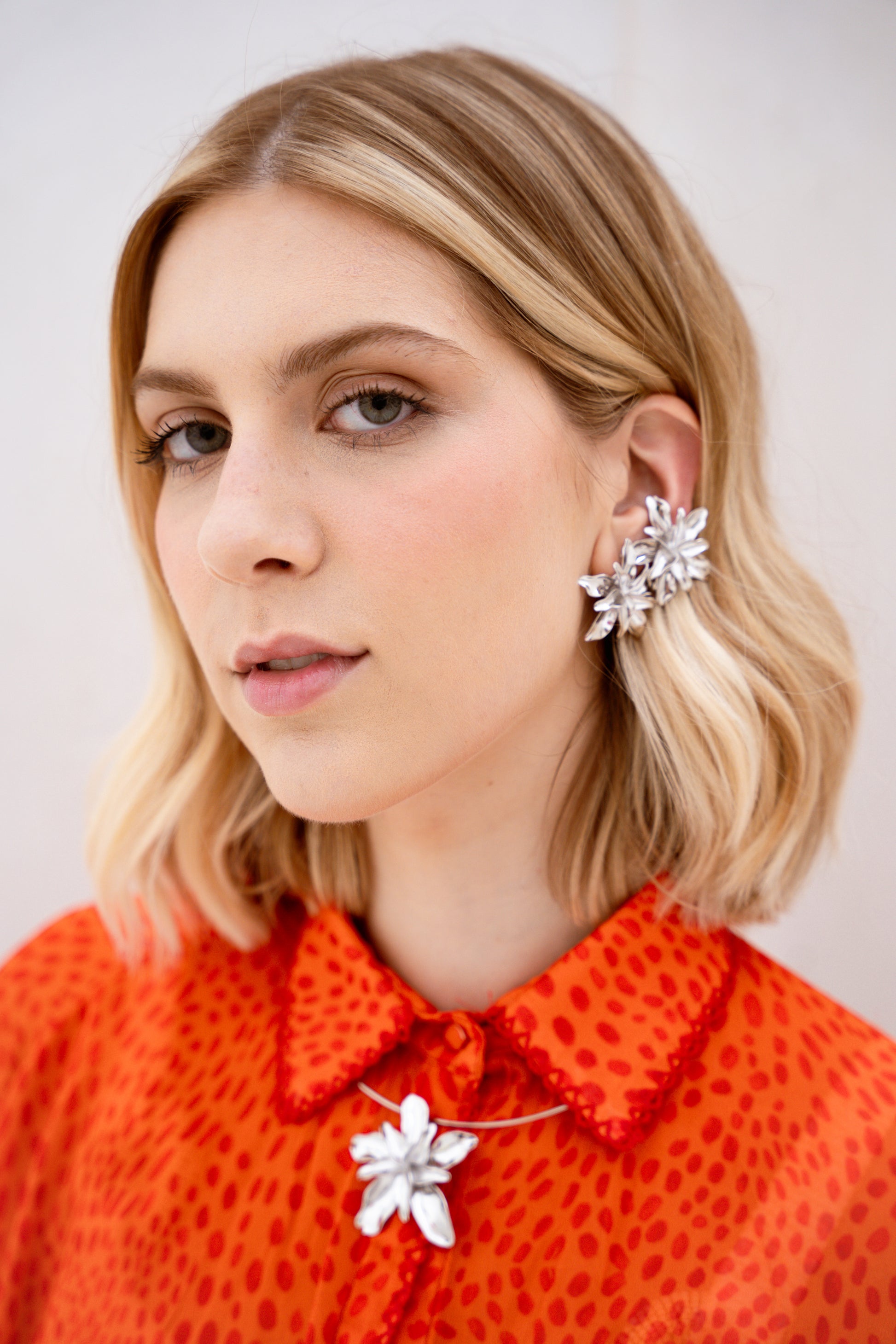Brinco em formato de flor no ródio branco (na foto a modelo está com dois na mesma orelha)