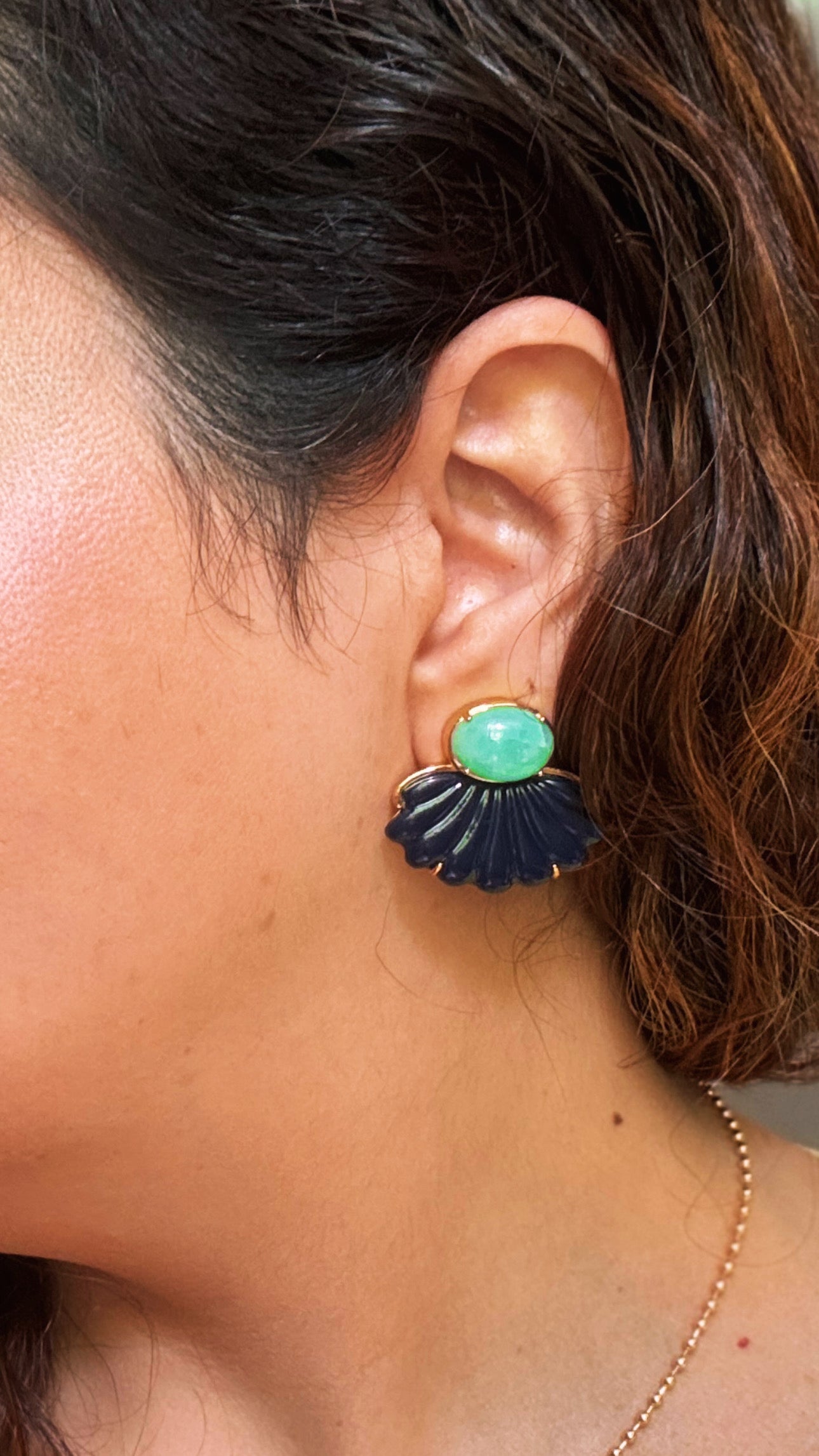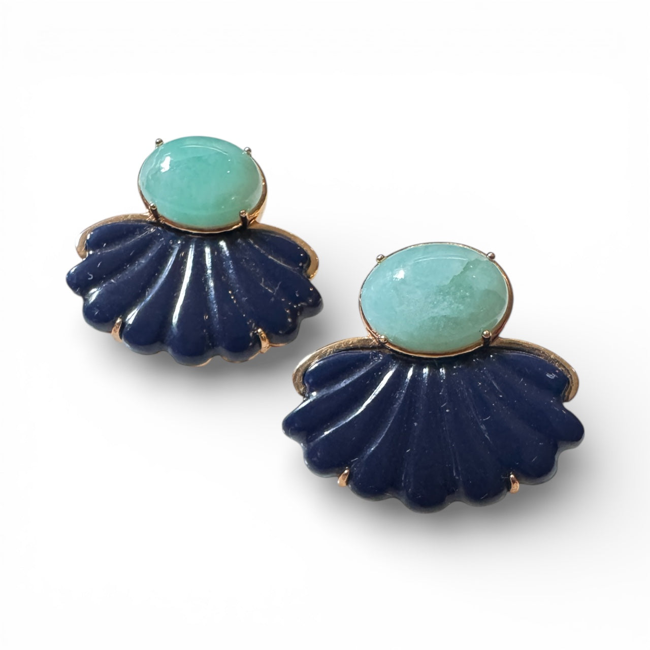 Brinco em formato leque com pedra amazonita natural e resina italiana no banho ouro 18k