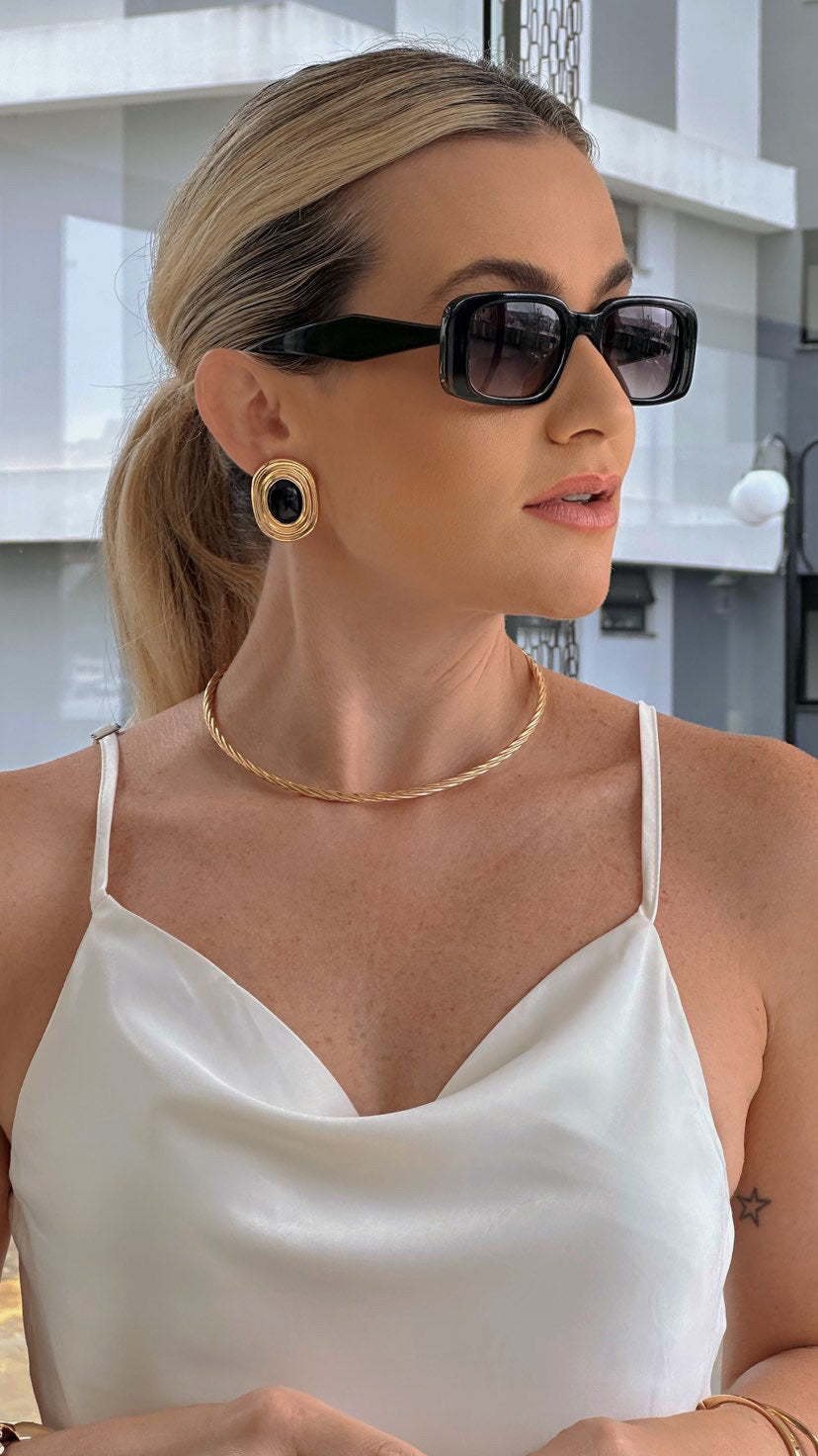 Brinco em Eletro formação com pedra resinada preta no banho ouro 18k com 10 milésimos.
