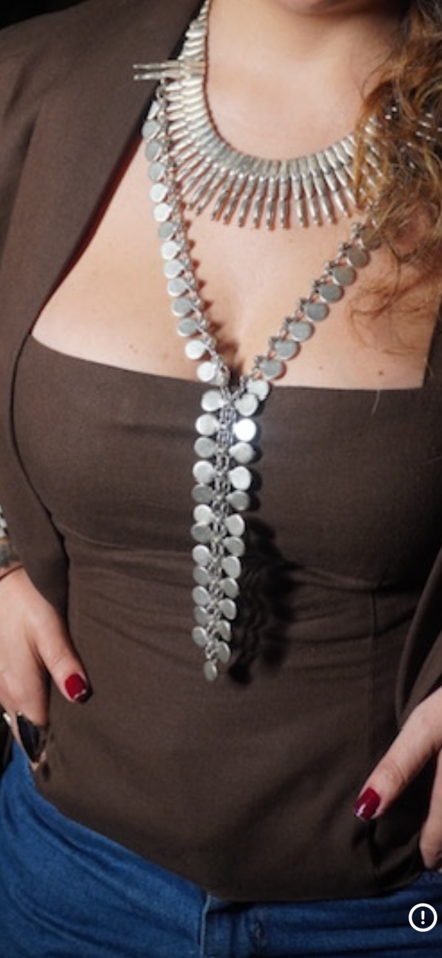 Colar feminino em estilo boho chic, com design marcante composto por múltiplas placas metálicas articuladas, que criam movimento, brilho e presença no colo e nas costas.