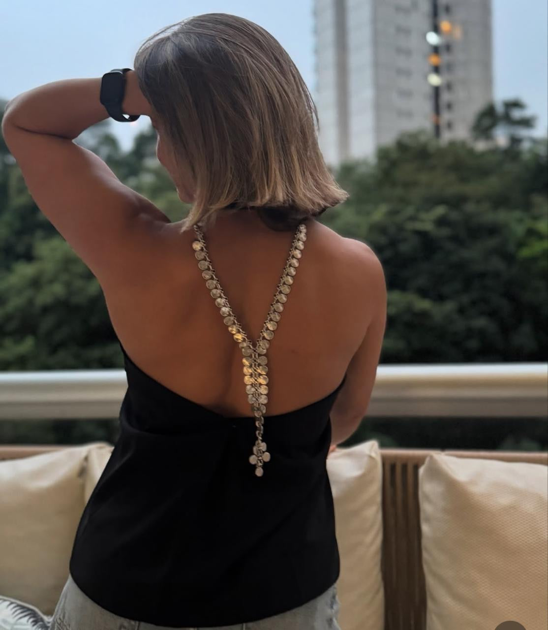 Peça versátil que pode ser usada tanto na frente quanto nas costas, valorizando decotes e trazendo personalidade ao visual.