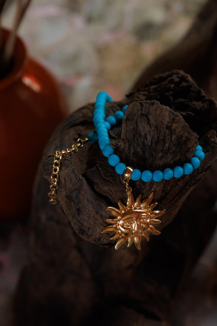 Colar com pedras turquesas e sol em formato orgânico no banho ouro 18k.